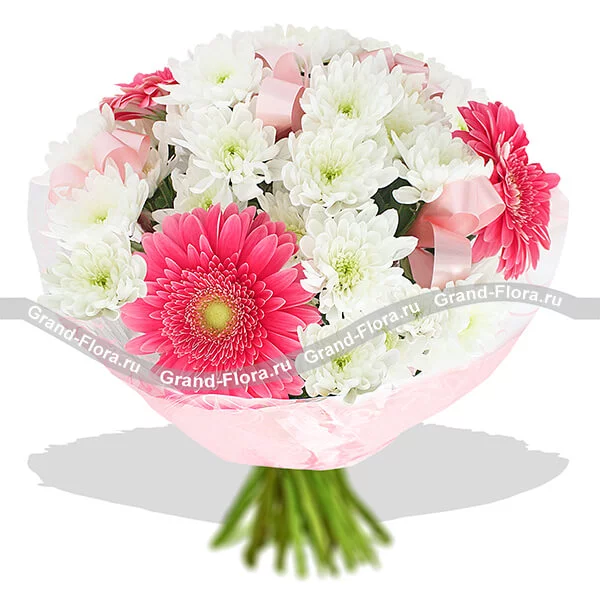 ДЕЛЮКС: хризантема кустовая белая - 11 шт., гербера розовая - 7 шт., фетр розовый, лента.